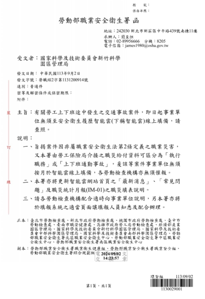 職安署公告-有關勞工上下班途中發生之交通事故案件無須至智能雲線上填備