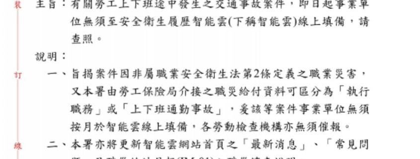 職安署公告-有關勞工上下班途中發生之交通事故案件無須至智能雲線上填備